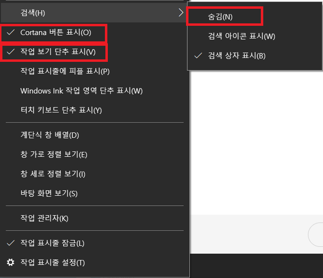 - 작업 표시줄 마우스 우클릭하여 아래 체크 해제 및 숨김(N)