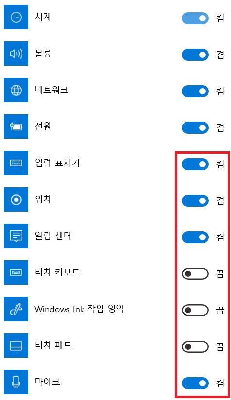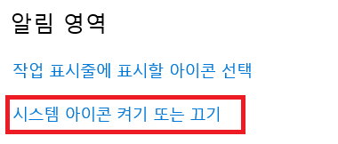 - 시스템 아이콘 켜기 또는 끄기를 클릭하면 아래처럼 나오는데 빨간 부분 해제.