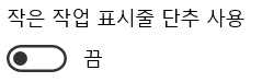 4. (선택)디스플레이 해상도가 너무 높지 않다면, 작업표시줄을 더 작게하여 실제 작업 공간을 늘리자. 작업표시줄 설정에 있다. 하지만 우측 시계에서 날짜가 사라지고 시간만 표시될수도 있다. (해상도에 따라 다름)