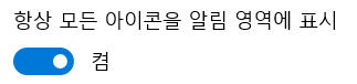 3. (필수)작업 표시줄에 표시할 아이콘 선택하여 '항상 모든 아이콘을 알림 영역에 표시'를 킨다. 항상 트레이 아이콘은 보여야 하며, 가리기보다 그것이 필요없음 여부에 따라 그 프로그램을 삭제하여야 한다.