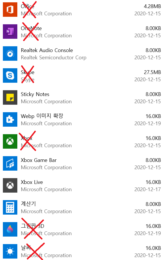 - 안지워지는 프로그램들도 억지로 지울 수는 있으나, 콘솔 창에 명령어를 넣어야 하기에 그냥 봐주자.