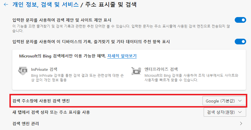 빙X같은Bing이 기본 검색이다. 아래를 따라해서 구글로 바꾸자. 네이버가 좋다면 네이버로 바꾸자.