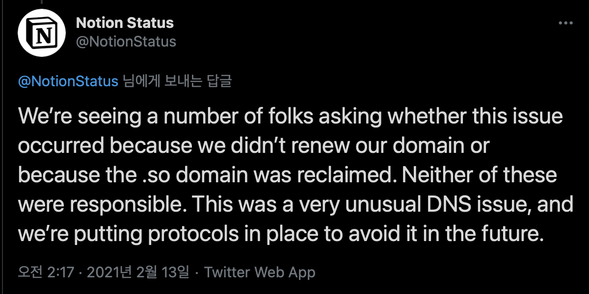 어제(2021년 02월 13일) 노션이 또 서버장애를 일으켰다. 도메인과 DNS 관련 문제라고 하는데, 급한 사람은 노션 ip를 타고 들어갔다고 한다. 오늘 13일이 되어서 새벽에 복구 되었다고 하는데, 오늘의 서버문제 자체는 큰 일이 아니었지만, 간헐적으로 서버가 터지며 불편을 초래하다 이번 사건으로 사용자들의 불만이 터지며 노션에 대한 충성도가 상당히 떨어질 상황이 되었음이 보이고 있다. 표면적으로 이것이 중요하지 않게 느껴질지 모르지만, 노션에게는 굉장히 중요한 위기일지도 모른다는 생각이 들었다.