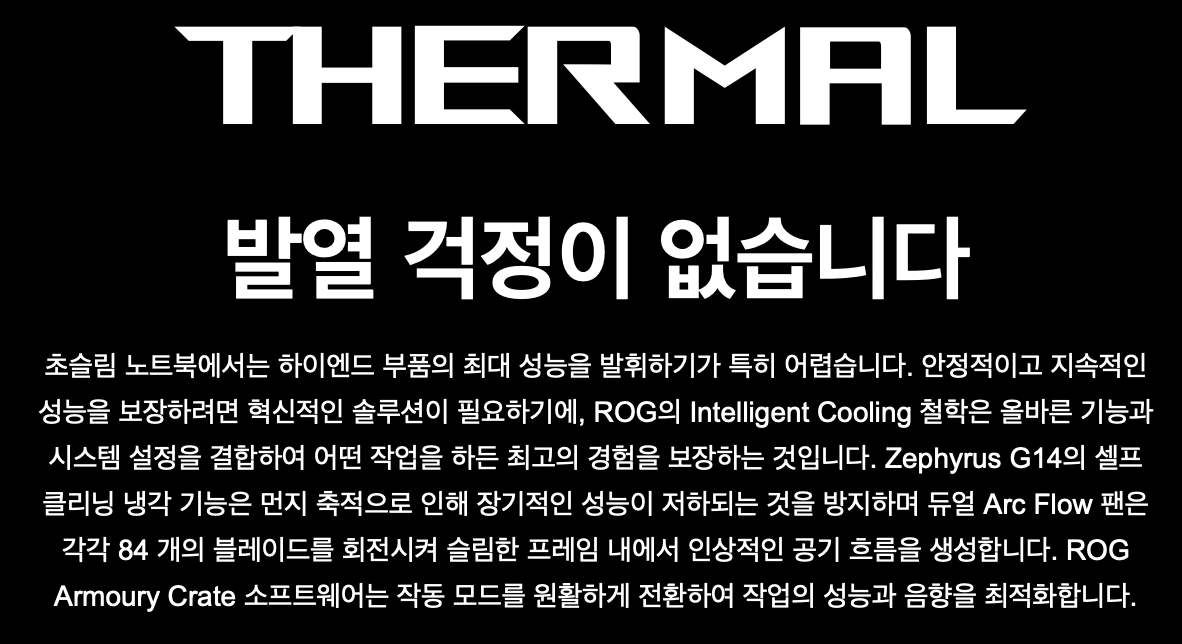 물론 그래픽카드에 들어가는 열 설계 전력인 TGP가 무거운 노트북들보다 조금 낮게 설정되어 있는 것은 단점이지만, 그럼에도 비빌 노트북이 없다. 이동하면서 그래픽 작업을 하며 집에서는 본체처럼 사용하는 클램쉘 모드로 사용할 유저라면 G14가 제격인 셈이다.