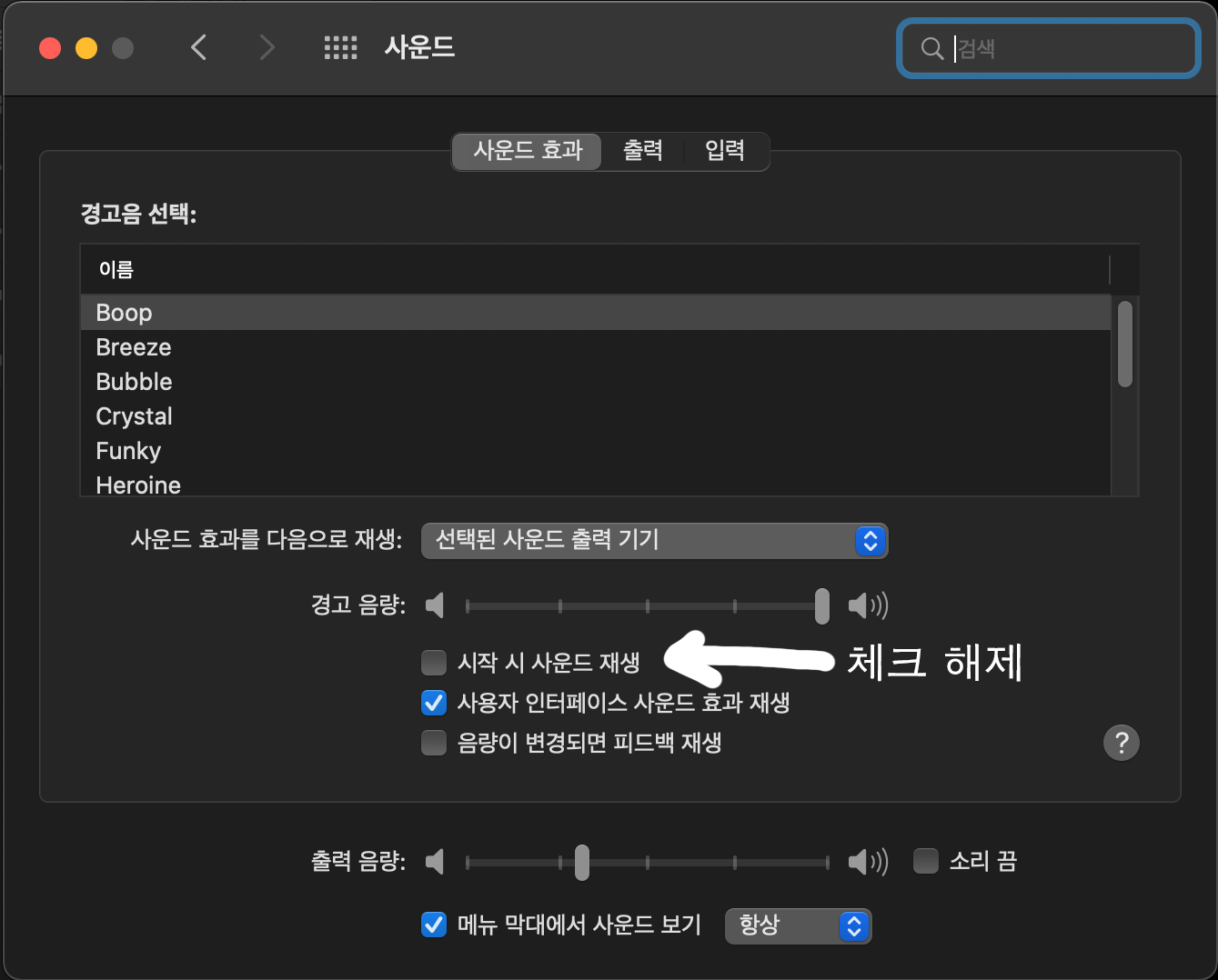 [시스템 환경 설정] - [사운드] - [사운드 효과] - 시작 시 사운드 재생을 체크 해제