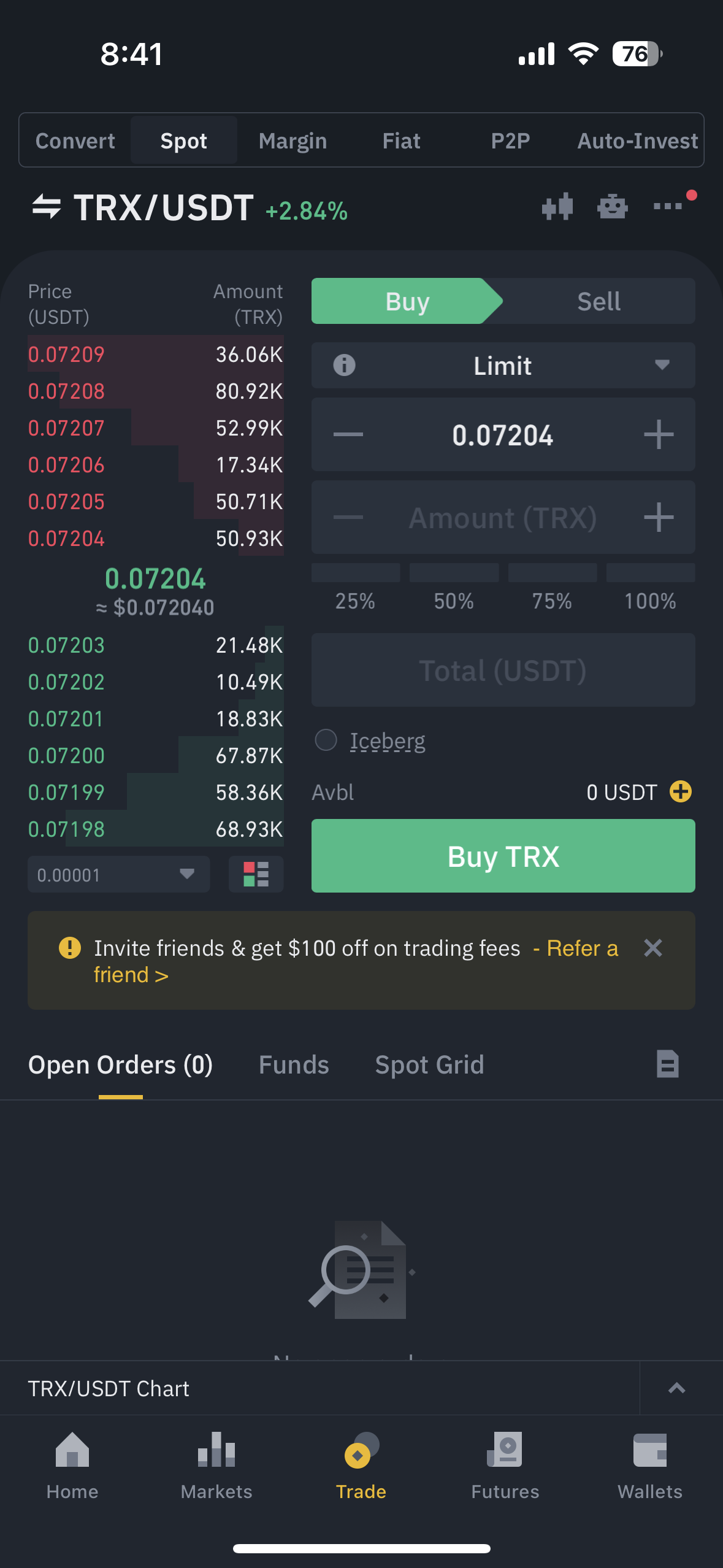 어플리케이션 기준 하단 탭 Trade -> 상단의 Spot -> 제목의 ***/USDT를 눌러 코인을 TRX/USDT로 변경 -> Sell 100% 매도 를 진행하면 USDT를 보유하게 된다.